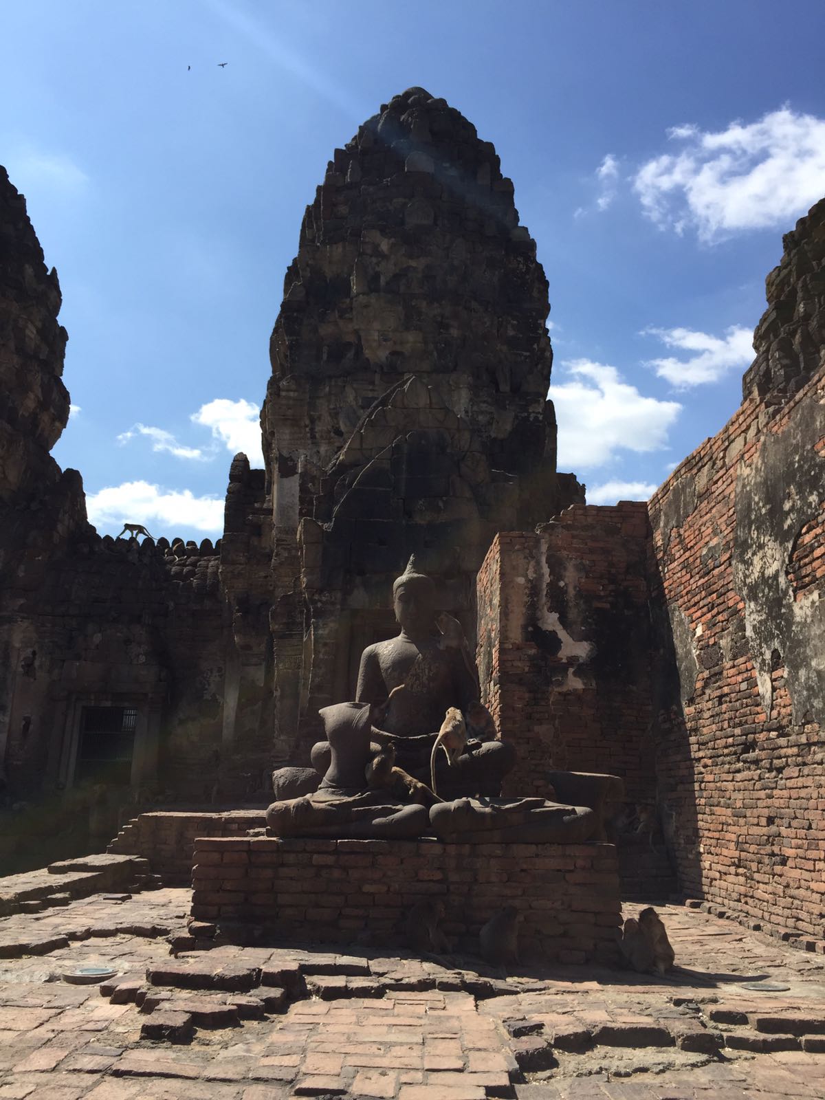 /LOPBURI/ Hier sollte ein großes Spektakel auf uns warten: die freilaufenden Affen! ja, ich sag es wieder: es war der Wahnsinn. Phra Prang Sam Yot befindet sich im Zentrum der Altstadt und besteht aus drei Prangs, die durch einen Gang miteinander verbunden sind. Ursprünglich als Hindu-Schrein errichtet, wurde das Bauwerk später als buddhistischer Tempel benutzt -…und so weiter und so fort: Das Wesentliche waren die Affen, die diesen Wat beschützten. Wir wurden auf unserem Spaziergang wild besprungen und strengstens auf Läuse kontrolliert. Es schien so, als ob das ihre Lieblingsbeschäftigung gewesen wäre und meine Brille zu stibitzen, aber mein charmantes Lächeln überzeugte wohl meinen kleinen Freund.